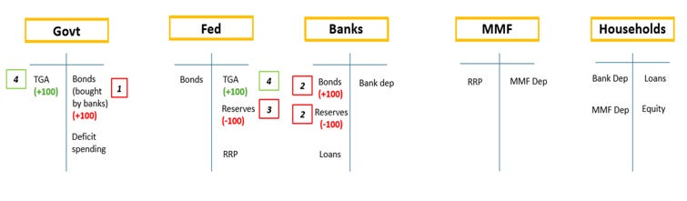 As step 1 the US government spends money (e.g. cuts taxes) which increases the bank account of households which receive an injection of net worth – they pay less taxes, hence their bank accounts are fatter. Bank deposits grow at commercial banks, which as a result see their reserves at the Fed grow too.