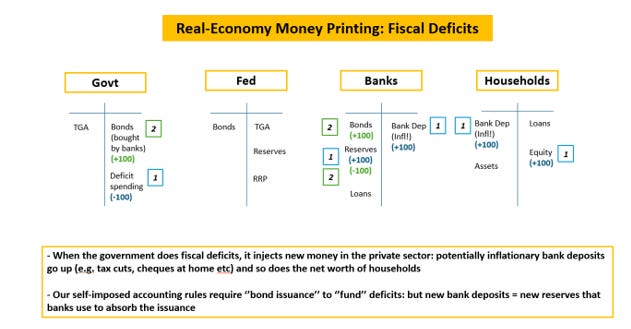 Step 2 describes the bond issuance pattern: the US government issues bonds to ‘’fund’’ deficits, and banks swap reserves for bonds at auctions.
