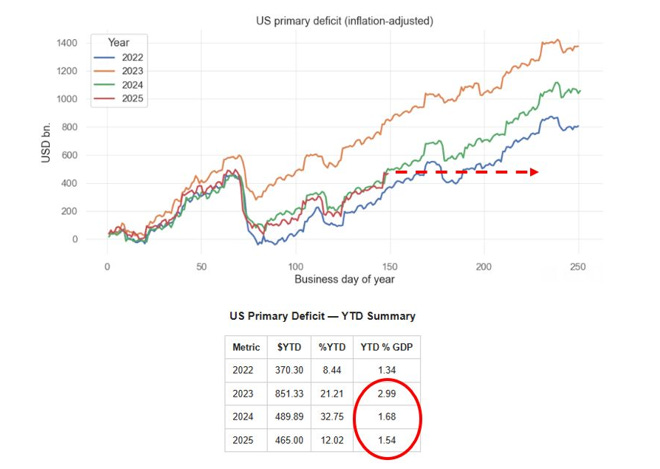 Our US primary deficit tracker stands at 1.54% of GDP as per last week, already lagging behind the 2024 pace and way behind the 2023 staggering pace.