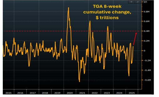 If the Treasury really goes for a such a fast TGA rebuild alongside with the reduced fiscal impulse coming from tariffs, the US economy could face a soft patch right when bank reserves fall towards scarce levels leaving banks more reticent to provide repo funding and to oil the leveraged financial system.