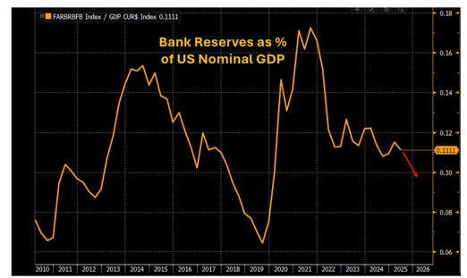 The last time we experimented with bank reserves below 10% of nominal GDP was in 2018-2019, and this eventually led to pressures in the repo market in September 2019.