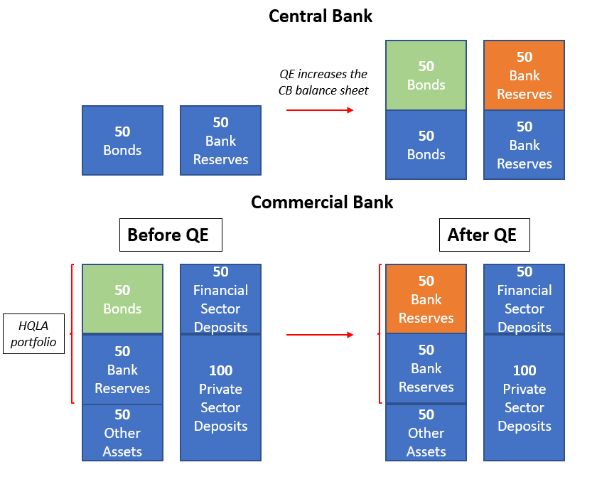 In any case, when the CB expands its balance sheet by acquiring assets (QE) or providing financing in exchange of collateral (e.g. BTFP, TLTRO) it also expands the liability side - it prints ''money'', but to be more precise it prints bank reserves.