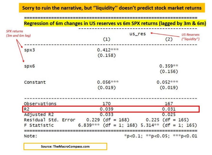 Bank reserves and stock markets both tend to go up over time and hence they look ‘’correlated’’, but analysing the rate of change of liquidity and S&P 500 returns helps with smoothing this problem away.