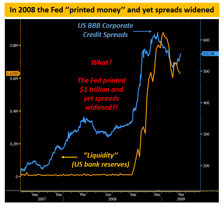 See what happened in 2008: the Fed ‘‘printed’’ almost $1 trillion (orange) very rapidly and yet corporate credit spreads (blue) kept widening as default risks were increasing due to the Great Financial Crisis.