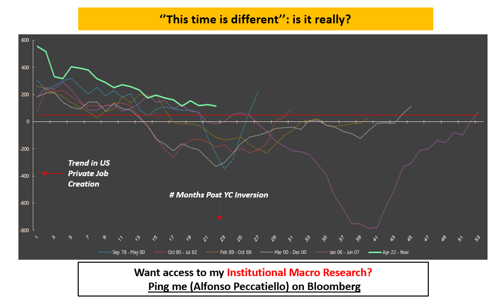 The chart below shows the trend in US private job creation (blue) in the months following a persistent yield curve inversion.